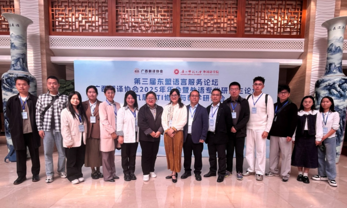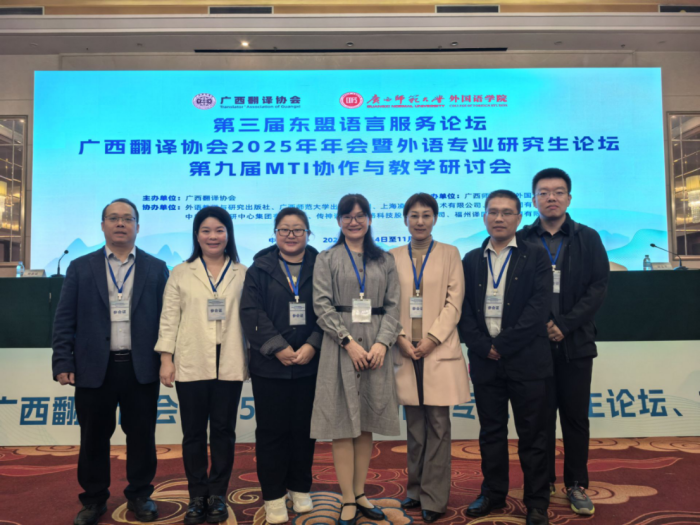 2025年11月14日-16日,由广西翻译协会主办、广西师范大学承办的第三届东盟语言服务论坛、广西翻译协会2025年年会暨外语专业研究生论坛、第九届MTI协作与教学研讨会在桂林召开,全国多所高校及行业企业的300余位专家学者、翻译界同仁和高校师生参加会议。公司曹治柳经理和蓝岚、张莉、李丹、向课书、张飞、门昕煜等7位教师及8名MTI专业研究生参加了此次学术盛会。