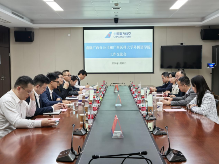在随后的座谈会上,南航广西分公司市场销售部经理蒋志明介绍南航业务及智慧航空服务等领域创新举措。韦建辉介绍了william威廉中文官网人才培养特色、员工专业与规模、实习就业等情况。南航广西分公司副总经理王雪雁热烈欢迎公司一行,详细阐述企业人才需求标准、岗位能力要求和员工职业发展路径等,肯定了外语类人才在国际航线服务等方面发挥的重要作用。